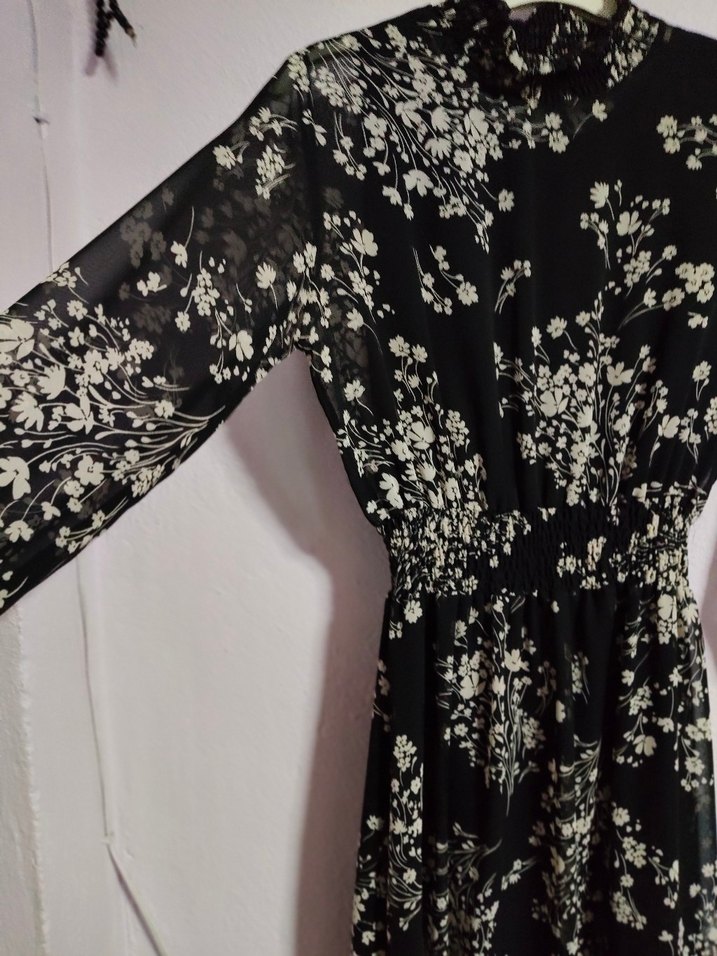 Uzun siyah elbise, çiçek desenli şifon ve astarlıdır. tam yazlık çok güzel bir elbise kilo aldığım için satıyorum