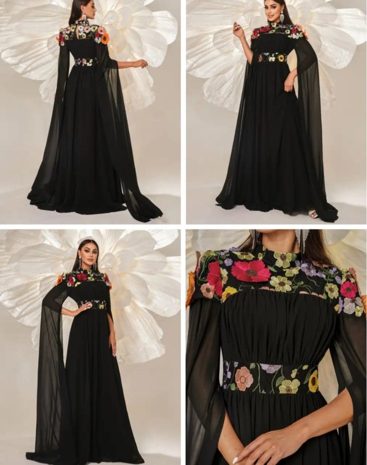 Uzun siyah çiçek desenli, bol kesim, uzun drapeli kollara sahip, bohem tarzda bir elbisedir. Düğünler için uygundur. etiketli hiç giyilmedi bedeni dar geldi iade edemedim isteyene detaylı atarm