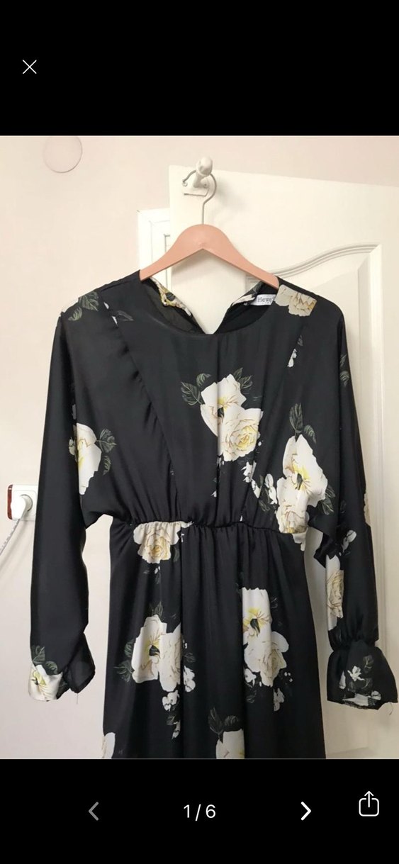 Uzun siyah elbise, bol kesim, V yakalı ve drapeli uzun kolludur. Yumuşak sentetik kumaş üzerine çiçekli baskıya sahiptir