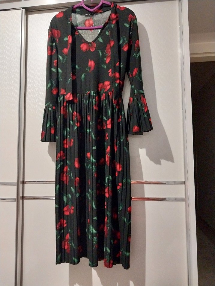 Uzun Siyah Çiçekli Piliseli Elbise 40 42 beden uyumlu.