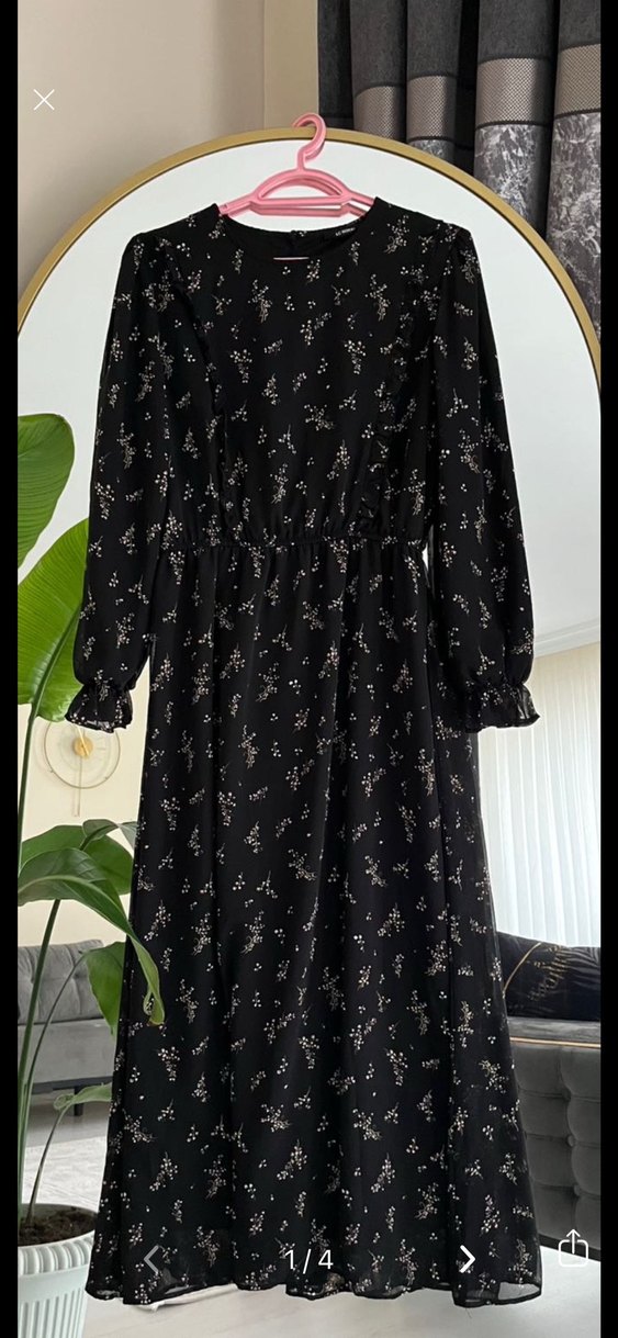 Uzun siyah elbise, yüksek yakalı ve uzun kollu, manşetlerde fırfır detaylıdır. Hafif çiçek deseni ve bol kesimiyle rahat bir kullanım sunar. Boy 135’. Astarlıdır. Defosu bulunmamaktadır.