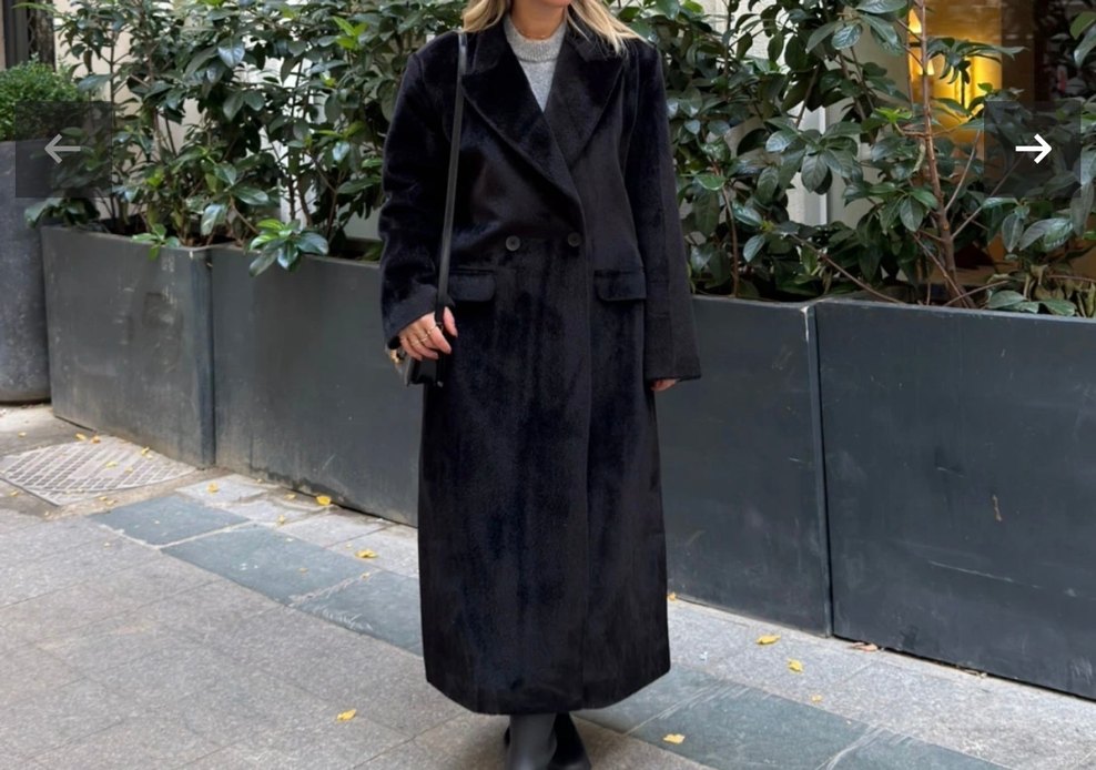 Marka temsilidir Uzun siyah kaban, çift düğmeli ve klasik yakalı. Hiç kullanılmamış tay tüyü gibi bir kumaşa sahip yumuşacık