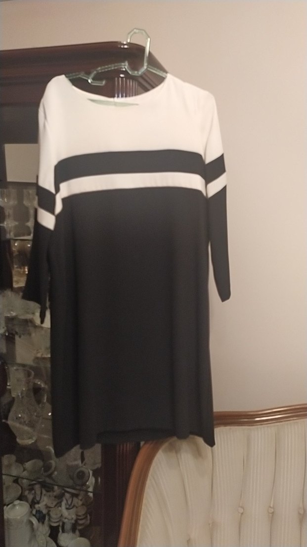 Uzun siyah elbise, salaş kesim, uzun kollu ve kayık yaka. Drapeli tasarım ve çizgili desene sahip, günlük kullanıma uygun.