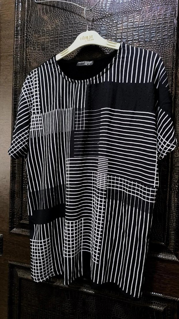 Uzun kesim, siyah-beyaz çizgili, pile detaylı ve tekne yakalı tişört, sentetik kumaştan,