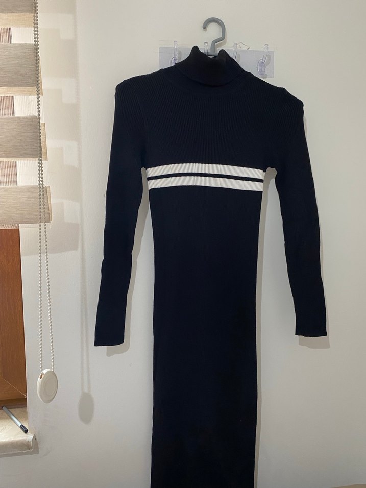 Dar kesim uzun siyah elbise, yüksek yakalı ve uzun kollu, triko örgülü sentetik kumaştan, çizgili desende. Sokak modasına uygun.