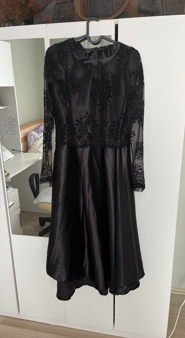 Uzun, siyah, dantel detaylı kollara sahip, klasik gotik şıklığını yansıtan dar kesim bluz ve eteği.