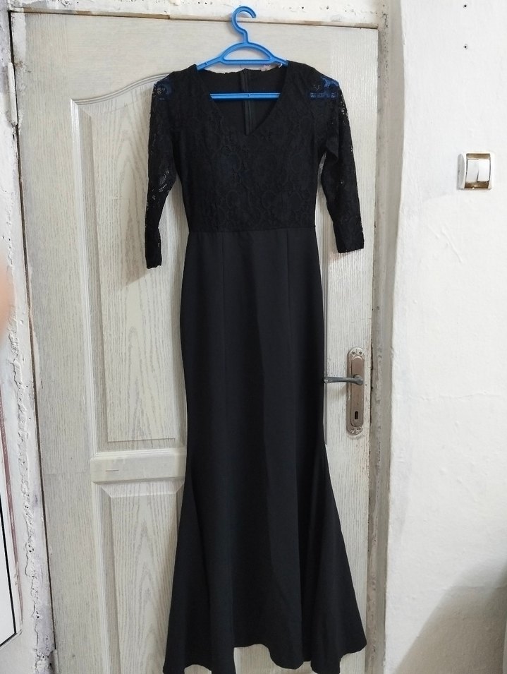 Uzun Siyah Dantel Detaylı V Yakalı Abiye Elbise