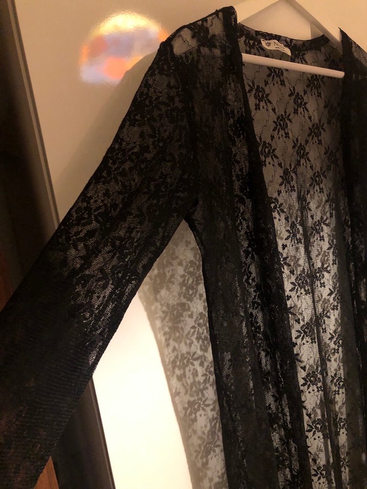 V yaka, askılı kollu, işlemeli dantel detaylı, sentetik kumaştan yapılmış, siyah ve uzun kesim gotik stil kimono. S- M bedene uyuyor etikete bakmayın