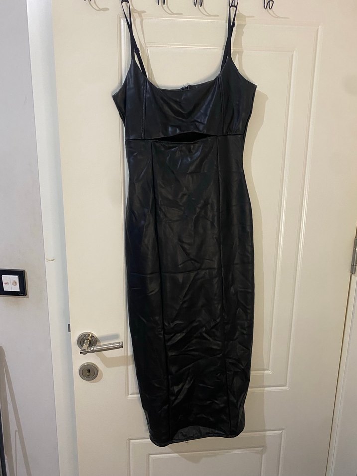 Uzun, siyah, deri tasarıma sahip bu elbise, romantik gece buluşmaları için gotik tarzda şık bir seçimdir.