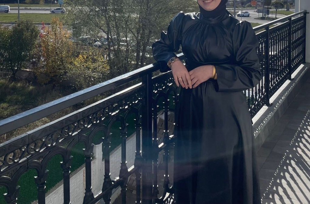 Uzun siyah elbise, yüksek yakalı ve drapeli detaylara sahip. İnce kesimi ve askılı kollarıyla gotik, sade ve modest tarzda.