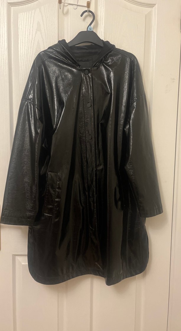 Uzun siyah deri yağmurluk, bol kesim ve drapeli detaylarla yüksek yakaya sahip. Uzun kollu ve desensiz, goth tarzını yansıtır.
