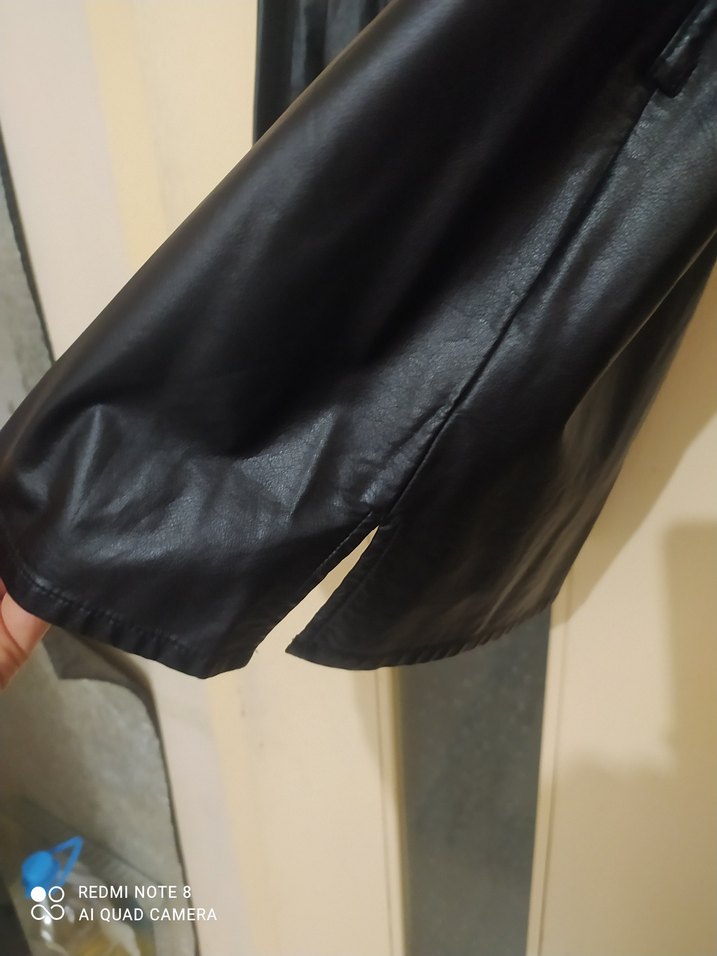 Uzun siyah deri kadın ceket, yırtmaç ve kesik yakalı, askılı kollu ve rahat kesimle sokak stili için uygundur.