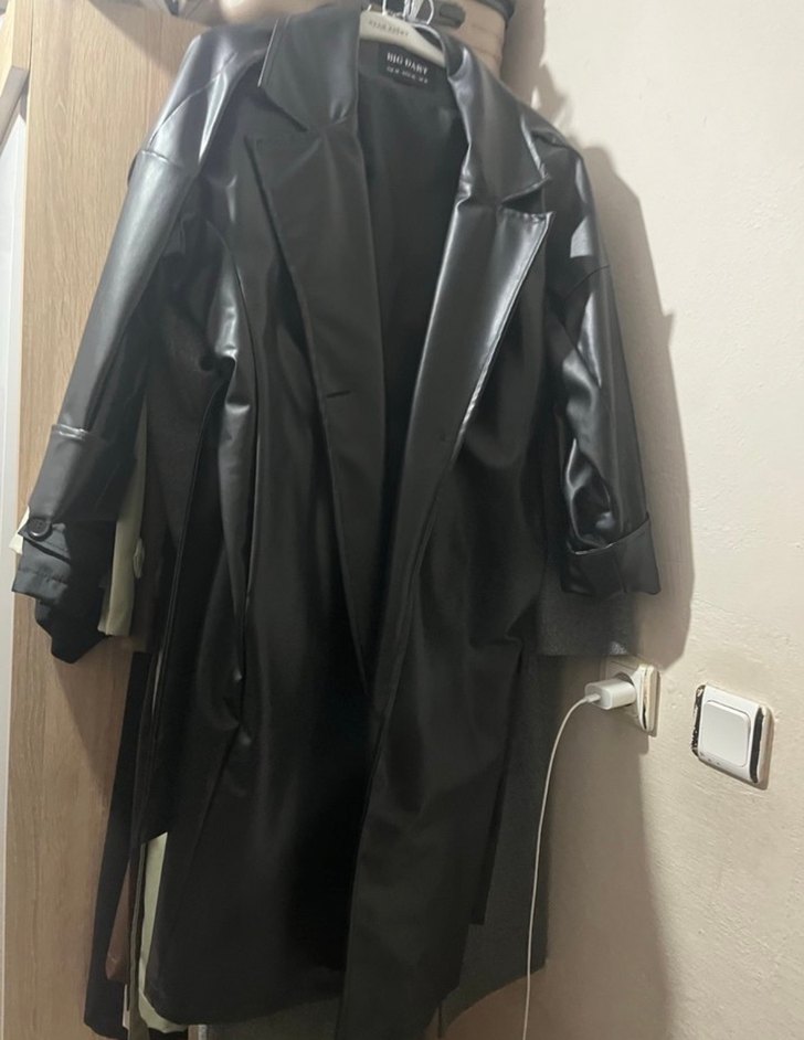 Uzun siyah deri ceket, keskin yakalı ve kemerli. Askılı kollara ve düzenli kesime sahip, ofis ve sokak stiline uygun.