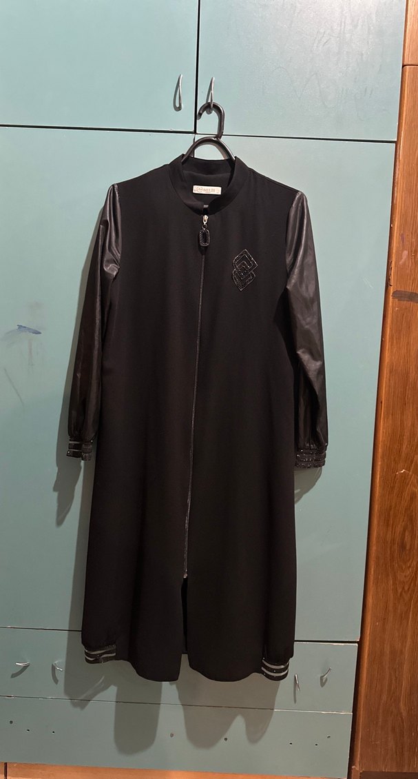 Uzun siyah kaban, deri uzun kollu ve göğüs kısmında nakış detaylıdır. Fermuarlı önü, modest regular kesimi ve yaka detayı vardır.