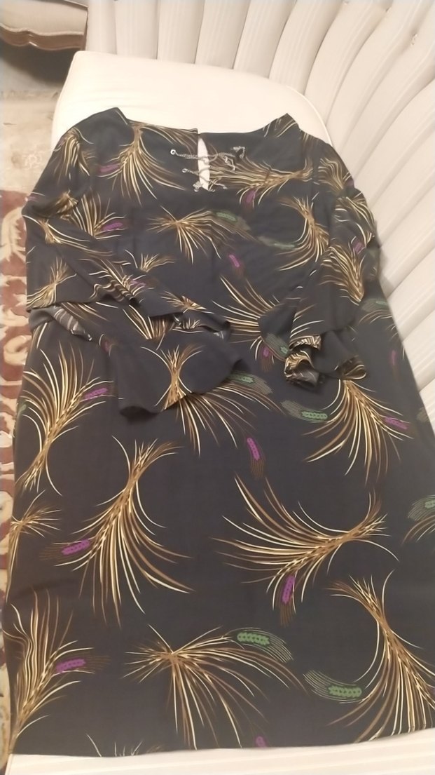 Uzun siyah bohem tarzı kadın elbise, bol kesim, drapeli detaylar ve V yaka ile. Uzun kollu ve desenlidir, günlük kullanıma uygundur.
