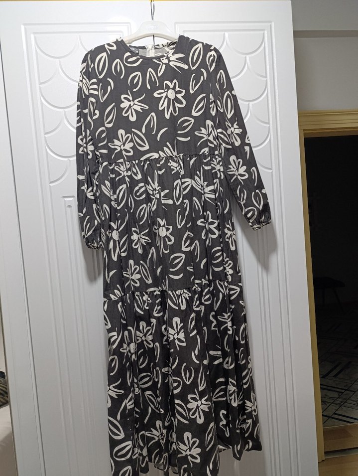 Uzun siyah elbise, bol kesim, tekne yaka ve pile detaylıdır. Baskılı desenli, sentetik kumaştan, bohem tarzda ve uzun kolludur.