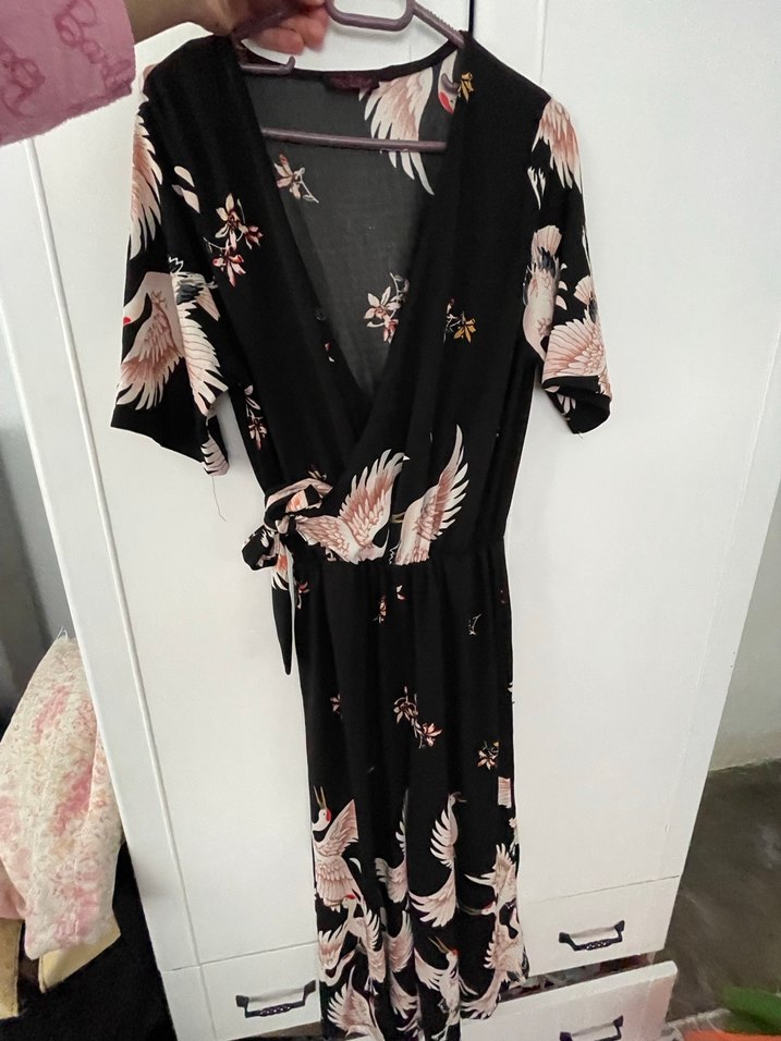 Uzun, bol kesim siyah kimono, ipeksi kumaş ve desenli. Drapeli, V yaka ve askılı kollu, bohem tarzda romantik akşamlar için uygun.