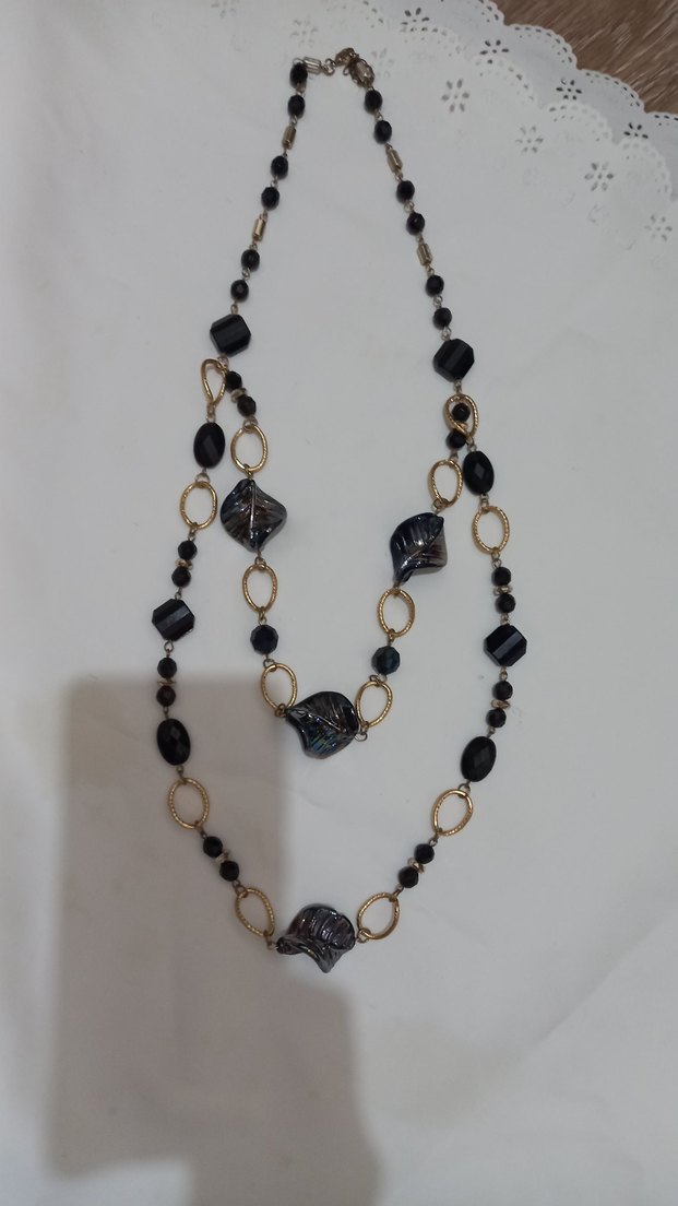 Uzun siyah desenli boncuklar ve altın renkli halkalar içeren bohem ve ışıltılı kolye.
