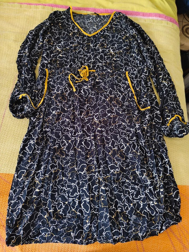 Uzun, bol kesim siyah desenli hamile tunik. V yaka, uzun kollu, sarı detaylı ve dökümlü tasarıma sahip, bohem tarzda.