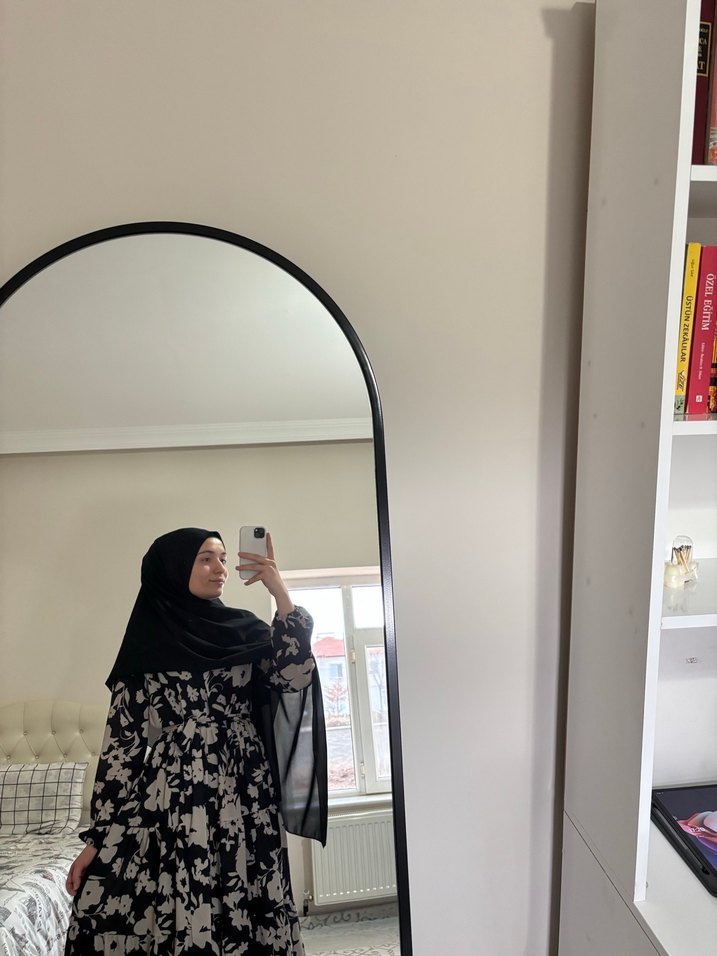 Uzun siyah elbise, bol kesim, yüksek yaka ve uzun kolludur. Şeffaf desenli sentetik kumaştan, mütevazı sokak stiline uygundur. Özel günlerinizde gönül rahatlığıyla tercih edebilirsiniz.
