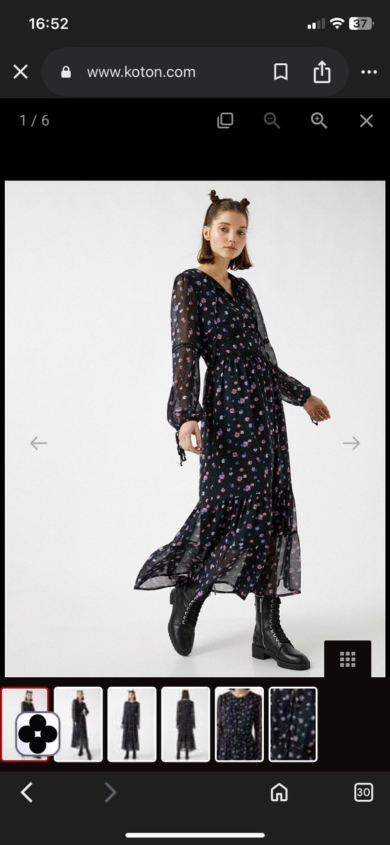 Uzun siyah elbise, bol kesim, uzun kollu ve V yakalıdır. Hafif sentetik kumaştan yapılmış, ince batik desenli ve kemerli tasarıma sahiptir. Aynı ürün sitesinde 900-1000 TL civarıdır ki oradan sipariş edilmiştir.