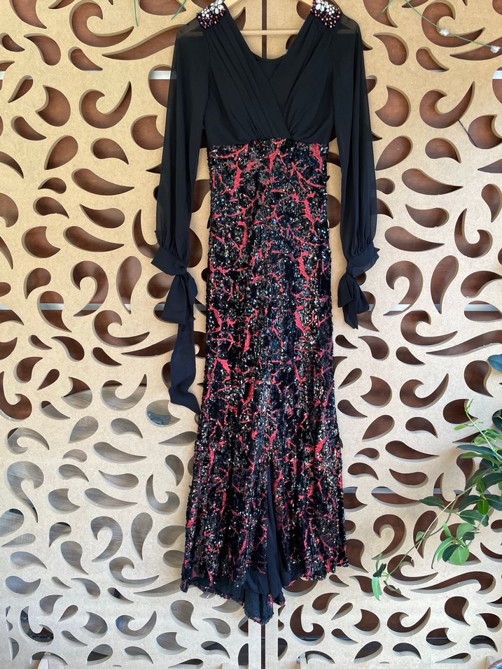 V yaka, uzun kollu, drapeli ve desenli uzun siyah kadın elbisesi. Koyu renkli ve kırmızı detaylı kumaşı ile avant-garde goth tarzını yansıtıyor. ✨