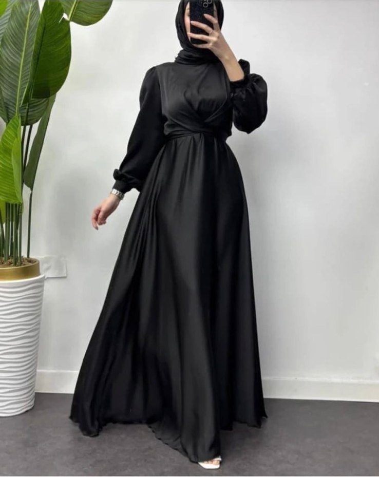Uzun, siyah renkte, yüksek yakalı ve dökümlü detaylı bol kesim elbise. Askılı kollarıyla klasik gotik tarzda, ofis için uygun.