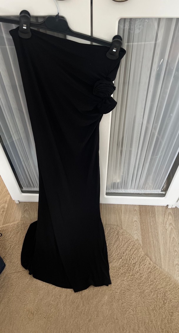 Uzun siyah renkte, dökümlü ve vücuda oturan gül detaylı eteği, ipeksi kumaştan üretilmiştir, günlük ve akşam yemeği için uygun şık gotik tarzda. Hiç kullanılmadı. Eyyo’dan alındı