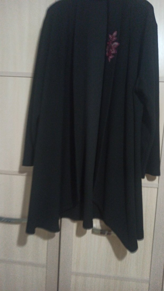Uzun siyah kaban, dökümlü tasarım ve kesik yaka detayına sahip. Bol kesim ve uzun kolludur, ofis kullanımı için uygundur.