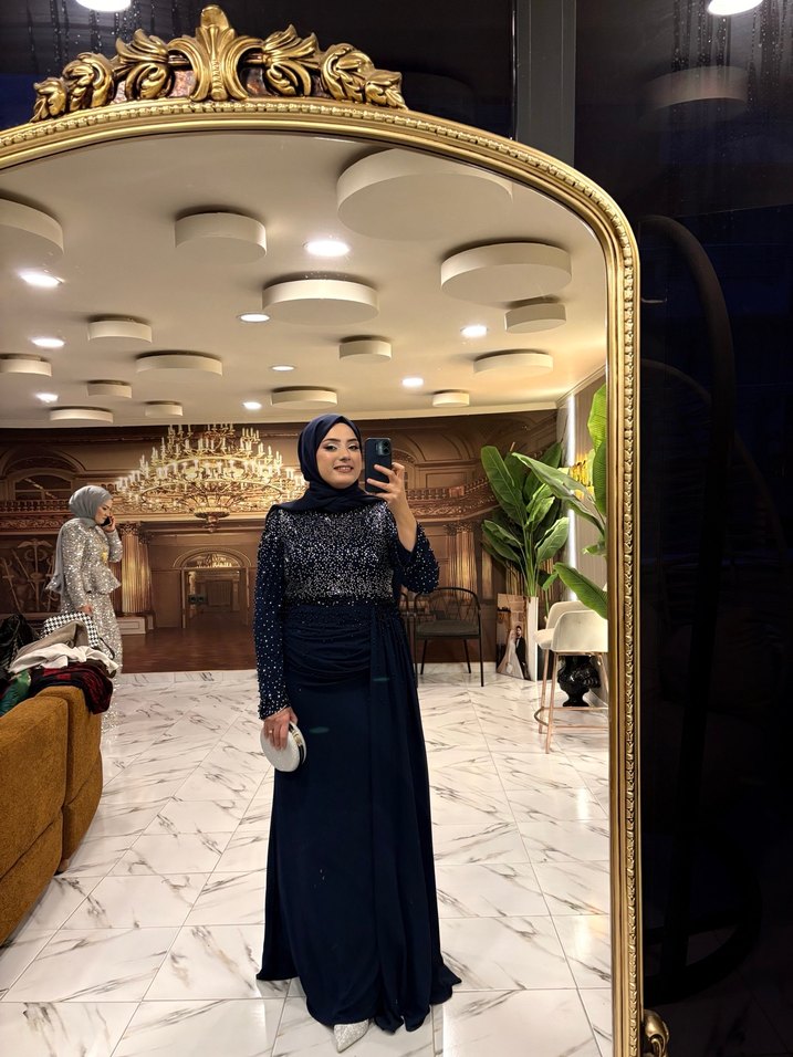 Yüksek yakalı, uzun kollu, drapeli detaylara ve etnik desene sahip siyah, uzun, vücuda oturan abiye elbise. Düğünler için uygun, modest ve gösterişli gotik tarzda. Likralı kumaş . Çanta, ayakkabı ve şal fiyata dahildir. Tam kombin hazır . Hennin markadır