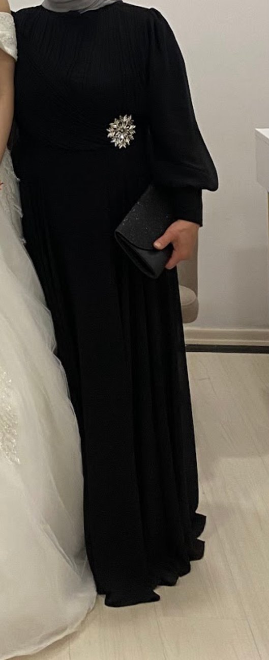 Uzun siyah abiye elbise, drapeli detaylara sahip ve vücuda oturan kesimlidir. Balon kol ve yaka stili şıklığı yansıtır.