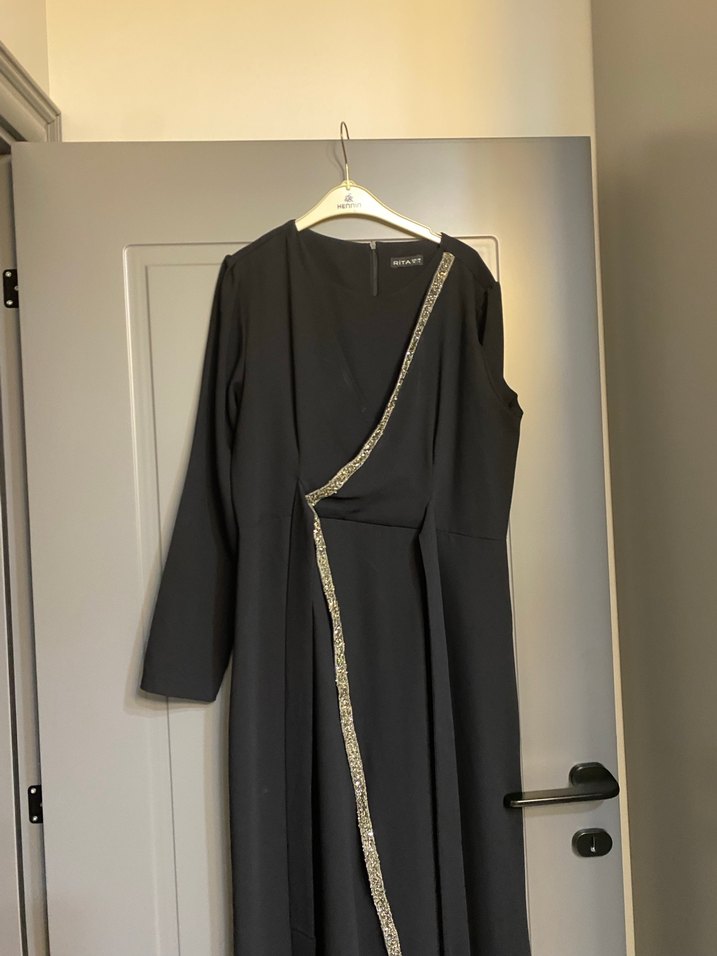 Siyah uzun elbise, drapeli tasarım ve nakış detayına sahip. V yaka, askılı ve uzun kollu, ipeksi kumaştan, modern klasik ofis tarzı için uygun.
