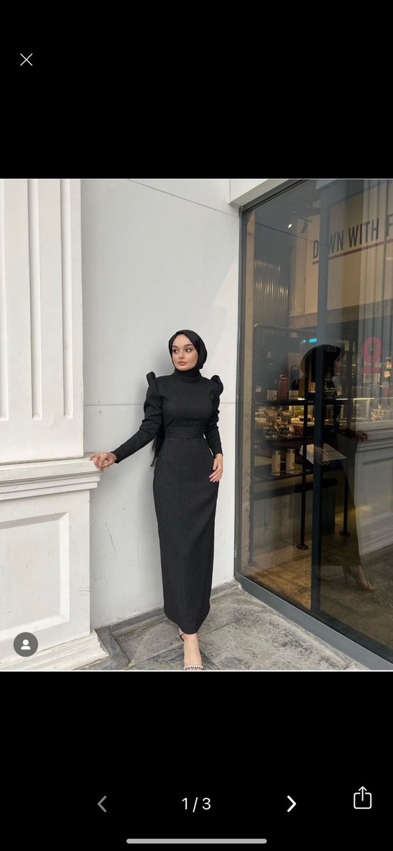 Ayşe Yamaçlı özel dikimidir. Uzun siyah elbise, yüksek yakalı ve drapeli detaylı uzun kolludur. Sentetik kumaştan, simli elbisedir. 38 bedendir.