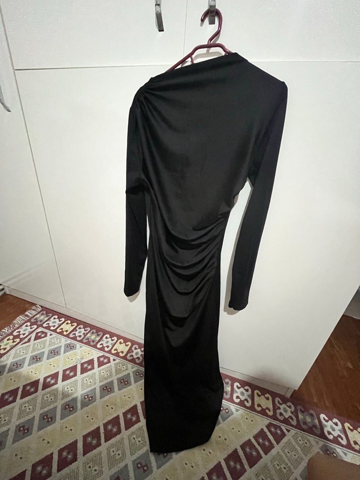 Bu uzun siyah elbise, yüksek yakalı ve uzun kolludur. Sentetik kumaştan üretilmiş olup, drapeli tasarımıyla gotik ve avangart bir tarz sunar. Romantik akşamlar için uygundur.