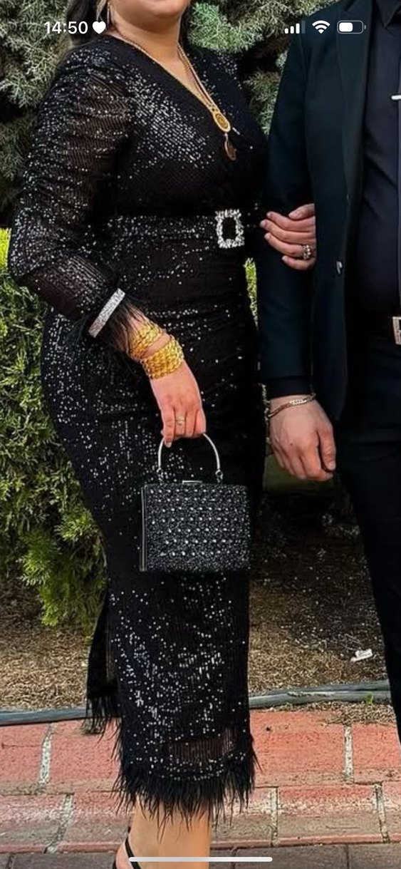 Drapeli, V yaka ve uzun kollu, desenli siyah uzun abiye elbise. Manşet ve etek ucu tüy detaylı, şık ve gotik tarzda parti elbisesi.