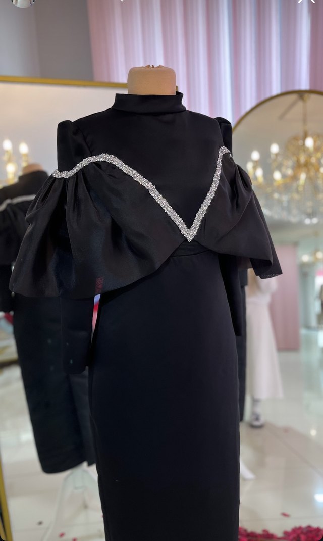 Bu uzun siyah abiye elbise, yüksek yakalı ve drapeli tasarımıyla öne çıkar. İşlemeli parlak detaylara, ince askılı kollara ve düzenli kesime sahiptir. Gotik ve avangart tarzlar için uygundur. K*r*l*k 690