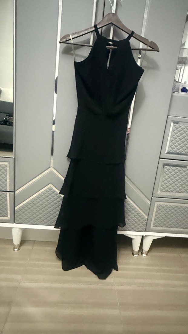 Siyah, uzun, drapeli ve sırt detaylı gotik tarzda, yüksek yakalı, dar kesim abiye elbise. Ofis için uygun klasik şıklık sunar.