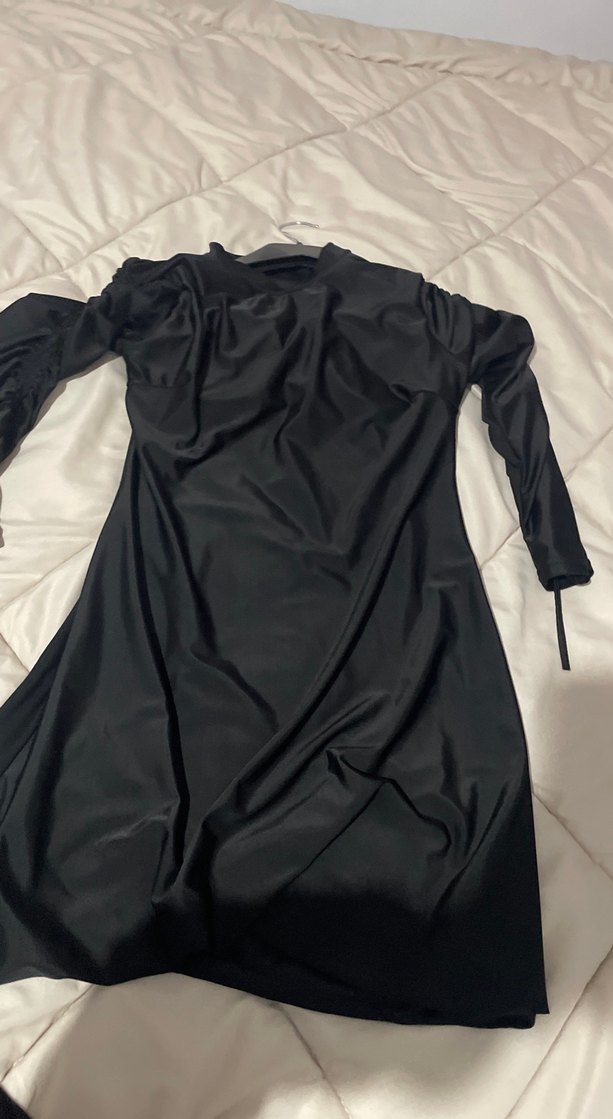Yüksek yakalı, uzun kollu ve drapeli tasarıma sahip, vücuda oturan uzun siyah elbise. Düz siyah renkte, gotik ve avant-garde stil için uygun, günlük kullanıma ideal.
