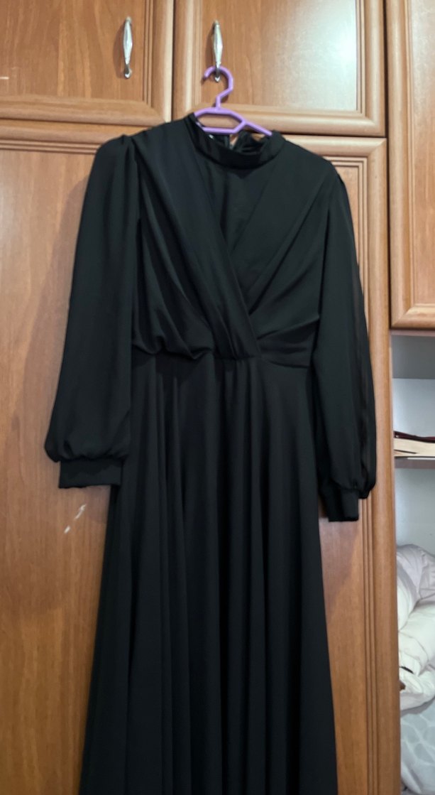 Yüksek yakalı ve uzun kollu, bol kesimli uzun siyah elbise. Pürüzsüz sentetik kumaştan, drapeli detaylı, mütevazı gotik tarz için uygundur.
