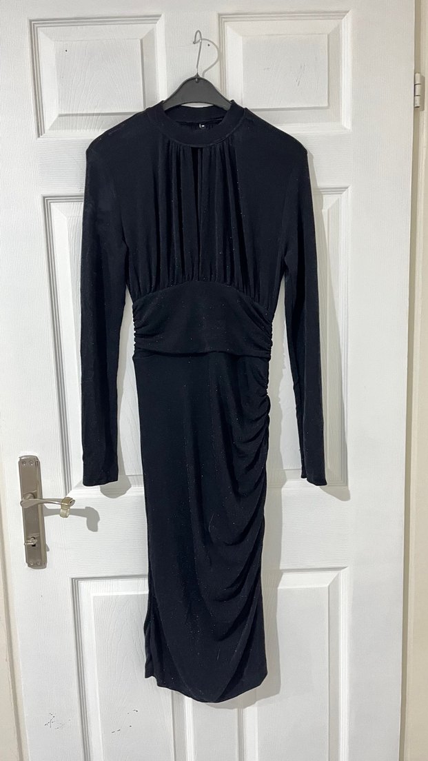 Siyah uzun elbise, yüksek yaka ve uzun kollu olup, drapeli detaylara sahiptir. Gotik tarzda ofis için uygundur. Pürüzsüz sentetik kumaştan yapılmıştır.