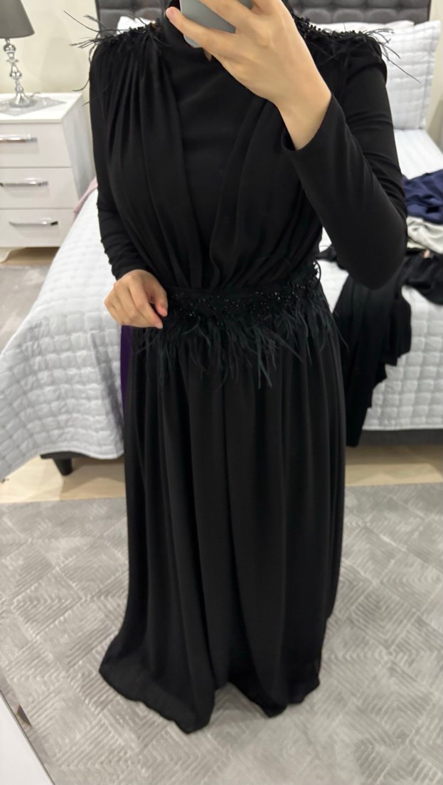 Uzun kollu, yüksek yakalı ve beli drapeli siyah, vücuda oturan bu abiye elbise, modest gotik tarz için uygundur.