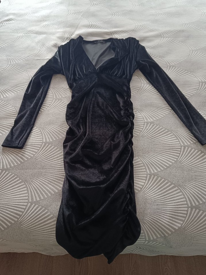 V yaka, uzun kollu, drapeli ve siyah renkli bu dar kesim abiye elbise, gotik ve avant-garde tarzlar için uygundur.