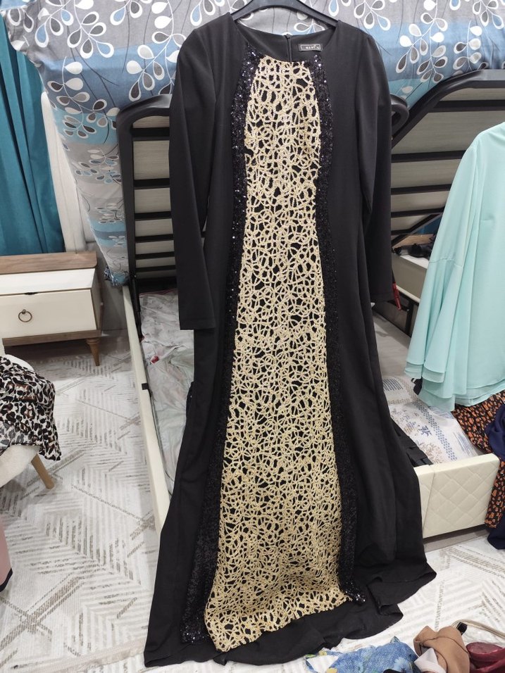 Uzun kollu, kuyruklu,maxi boy,notched lapel yakalı, vücuda oturan siyah elbise. Sentetik kumaştan, önü bej-siyah desenli ve drapeli, modern gotik tarzda, düğünler için uygun.