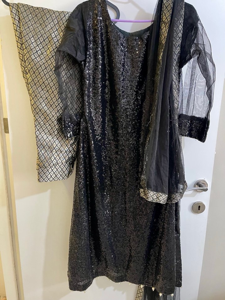 Bu uzun siyah abiye elbise, bol kesim ve drapeli detaylara sahip. Tekneli yakası ve desenli kumaşıyla gotik, şık bir görünüm sunar. Uzun kolludur, parti için uygundur. ✨