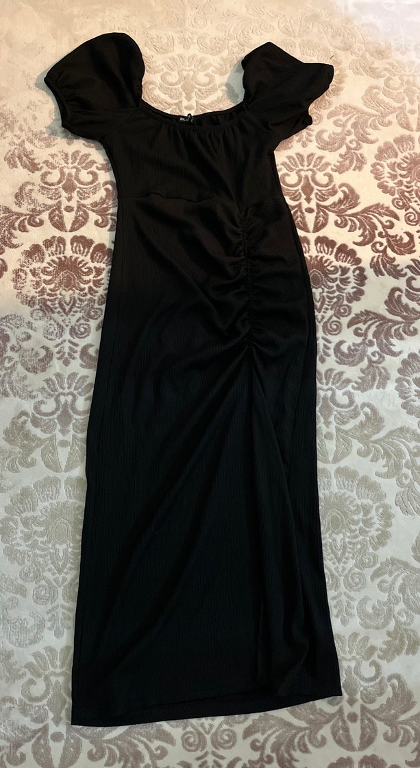 Siyah, uzun ve drapeli, kayık yaka, elbise