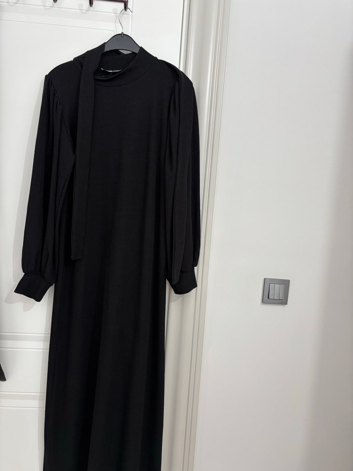 Uzun kollu, yüksek yakalı, drapeli siyah kadın elbisesi. SM beden wishtex marka