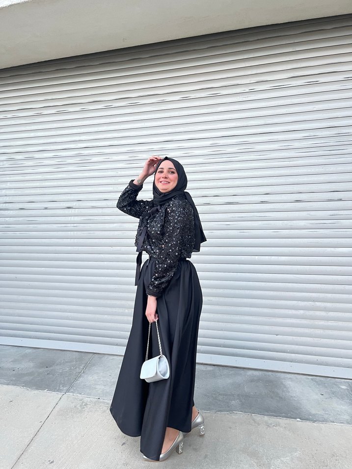 Uzun, siyah, bol kesim drapeli elbise, uzun kollu ve sentetik kumaştır. 2 parçadır altı etek üstü uzun kollu croptur. 1.500 tl ye aldım ve bir kez giydim fiyatı uygun tutuyorum indirim istemeyin. 36 bedendir 55 kg ya kadar oluyor. Alıcısına hayırlı olsun