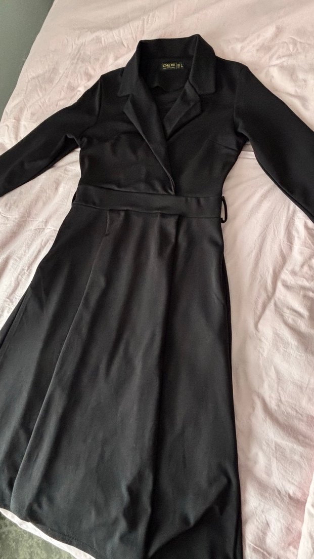 Uzun siyah elbise, ince kesim ve yaka detayıyla klasik şıklık sunar. İpeksi kumaştan, strappy kollu, ofis ortamına uygun.