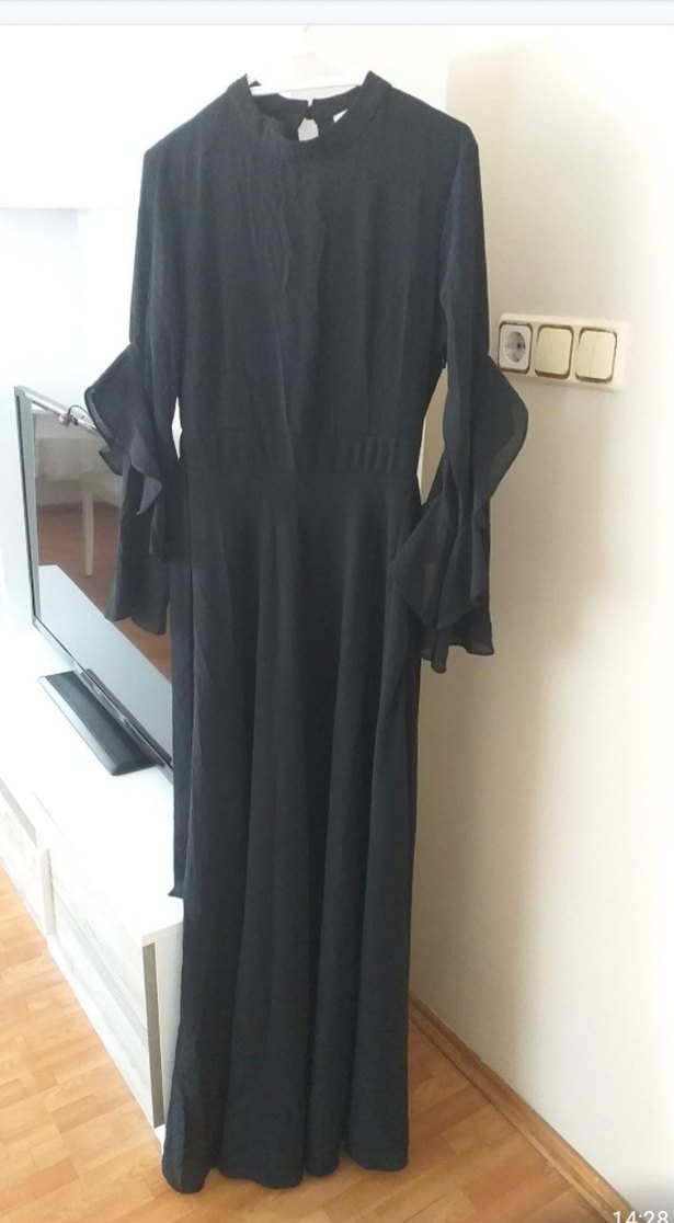 Yüksek yakalı ve uzun kollu, drapeli detaylara sahip uzun siyah elbise. Düz kesim, sade ve modest tarzda, sentetik kumaştan, ofis için uygun.