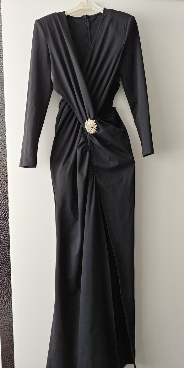Drapeli tasarımı, notlu yaka ve uzun kollu detaylarıyla siyah, uzun ve vücuda oturan kadın elbisesi. Düğünler için uygun, broş süslemeli.